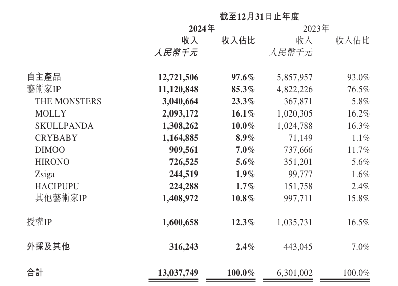 根据IP划分,泡泡玛特的自主产品已经成为了支撑公司业绩的关键力量。其自主产品——艺术家IP和授权IP的收入为127.22亿元,在总营收中的占比高达97.6%;外采及其他的收入在总收入中的占比仅为2.4%。